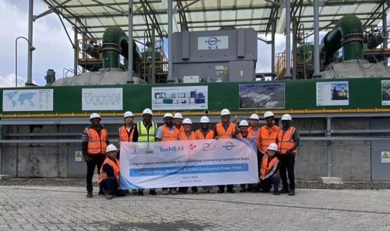 3月5日,開山集團(tuán)股份有限公司在肯尼亞Menengai地?zé)釁^(qū)全資擁有并建設(shè)的第一座地?zé)犭娬荆↘K01——Kaishan Kenya 01電站)順利完成了從2月2日開始的為期30天穩(wěn)定性運(yùn)行測試,至此,該電站全部的獨(dú)立第三方見證測試均已完成,明天,獨(dú)立工程師將頒布證書并通知肯尼亞國家電網(wǎng)公司KPLC,宣告這座電站實(shí)現(xiàn)商業(yè)運(yùn)行(COD)。